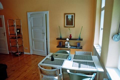 Der großzügige Wohn-Essbereich ist geschmackvoll und individuell ausgestattet und lädt zum Verweilen ein. Hier läßt es sich gemütlich beisammen sitzen oder das Frühstück am offenen Fenster genießen. Lassen Sie den Trubel der Großstadt einen Augenblick lang hinter sich und genießen sie den Blick in das grüne Steglitz.